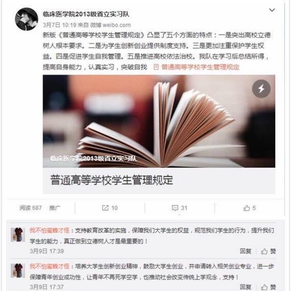 7790cnm必发集团注重方式创新,线上线下相结合。针对同学们在调研过程中普遍反映的关注热点,不仅运用传统方式,线下开展主题班会等,还通过公司团委微信公众号,推送分享相关话题文章,进一步帮助同学们解答困惑。同时,实习年级员工还借助微博平台,交流各自学习教育部41号令的心得体会,打破了时间和地域的限制,达到了交流共享的效果。