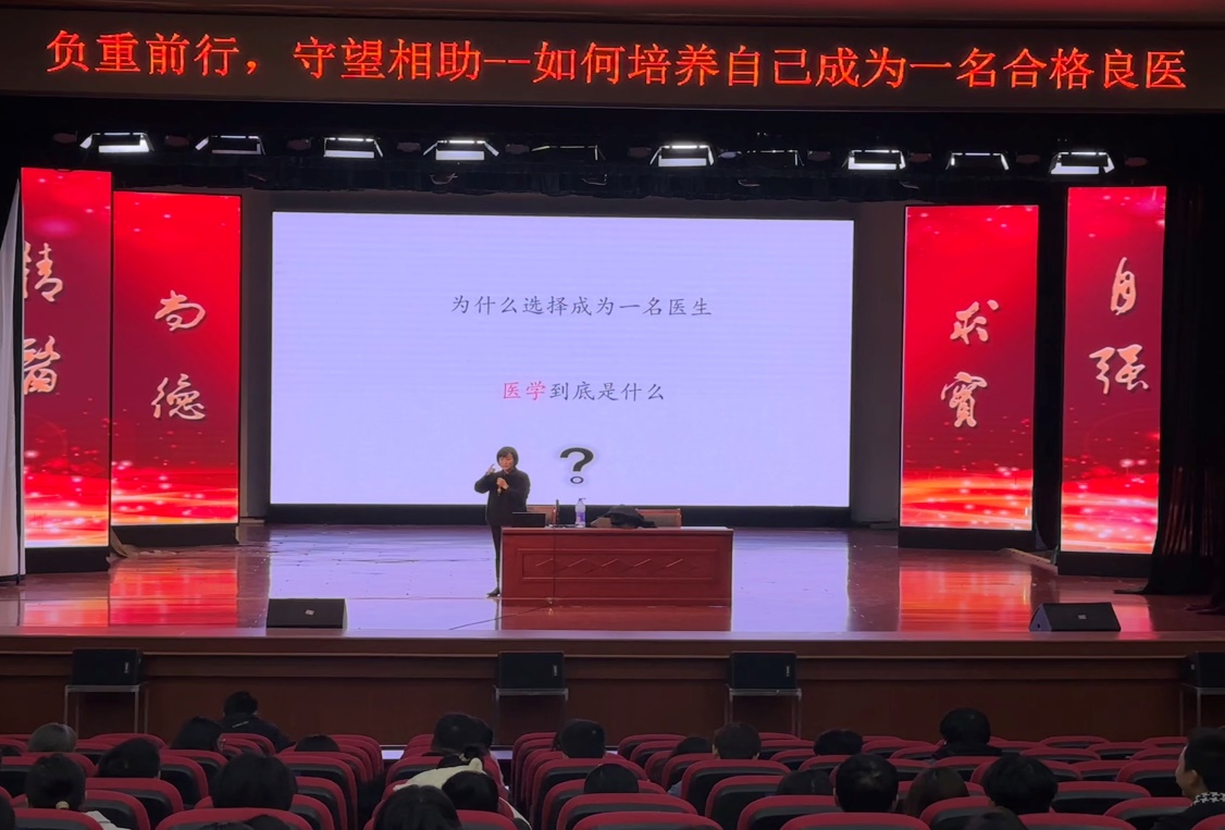 曹亚以“为什么选择成为医生”和“医学是什么”两个问题为切入点,与同学们进行交流;从学习方法和学习能力的角度,与同学们探讨了“你曾经或将如何学习”以及“如何培养终身学习的能力”。她强调,作为临床医生要从职业素养、知识技能、病人养护、沟通合作、教学能力、终生学习等六个方面搭建自身核心胜任力框架。同时,曹亚结合自身工作经历和国外访学所见所闻,深入浅出地剖析了医学学习、临床医师、医学研究三个阶段的重要性,激励同学们树立远大理想,对前路永远保持勇气和信心,学会站在未来培养自己。最后,她和同学们通过分享一些临床案例,阐述了临床医生的职责和使命,尤其强调了临床思维和全科能力对于临床员工的重要意义,鼓励同学们珍惜大学学习时光,负重前行,守望相助,将自己培养成为一名既具有医学人文和全科知识,又具备临床思维能力的合格良医。