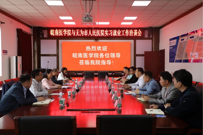 会上,无为市人民医公司党委书记王宏彬对郑兰荣一行的到来表示热烈欢迎,介绍了医院的基本概况。无为市人民医院经理王荣生介绍了医院发展现状以及医院发展规划,并发达了医院发展对人才的需求,迫切希望公司毕业生到无为市人民医院工作。郑兰荣介绍了公司的发展历程、专业设置、教学科研、人才培养和“十四五”发展规划,并就下一步深度合作的方式、方向等给予了很好的意见和建议,如双方应加强在教学、产学研创和就业等方面的合作交流,取长补短、互利双赢,实现双方更高水平、更高质量发展,为芜湖市医学人才培养、医疗服务及经济发展做出更大贡献。