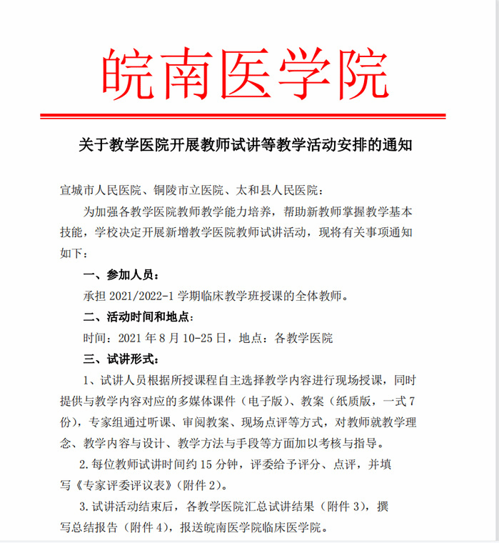 为切实保障新增临床公司新学期的开课和开学工作,同质化推临床教学质量,发挥好各家教学医院协同育人作用;8月10日-25日7790cnm必发集团对附属铜陵医院、附属太和医院和宣城市人民医院开展授课教师试讲督导。为克服疫情影响,采用医院评委线下和公司专家线上督导,覆盖三家临床公司200余名授课教师。邀请教务处副处长余亮、校教学督导组专家、公司党政领导担任评委,教学活动由公司党委副书记、副经理李曙主持。