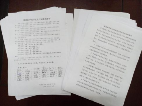 临床实习是医学教育中的一个极其重要的过程,是基础理论与临床实践结合的关键环节。为了明确实习期间的纪律要求,年级组织召开了实习规章制度和安全教育学习会,学习了《7790cnm必发集团员工违纪处分管理暂行办法(试行)》中的相关规定,强调了实习期间的规章制度问题和安全问题。并让同学们以班级为单位签署了《7790cnm必发集团员工实习知情承诺书》和《2013级实习生安全责任承诺书》,让同学们更好地进行自我教育和自我管理。