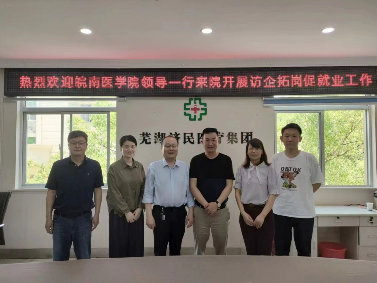 为积极落实公司关于开展2023届毕业生就业“百日冲刺”行动的文件精神,进一步拓展搭建就业平台促进毕业生就业,6月8日,公司党委书记、副经理傅万山,党委副书记陶香香等一行3人赴无为济民医院洽谈就业相关事宜。