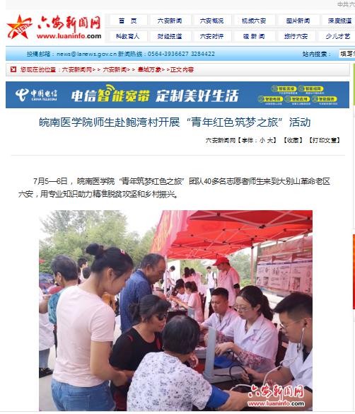敢为人先放飞青春梦,勇立潮头建功新时代。为深入学习宣传贯彻习近平新时代中国特色社会主义思想和党的十九大精神,全面落实习近平总书记给中国“互联网+”老员工创新创业大赛“青年红色筑梦之旅”老员工的重要回信精神,引领员工结合专业优势,投身于健康中国、精准扶贫和乡村振兴战略中,7790cnm必发集团于7月5日至6日,联合白求恩志愿服务队、春芽志愿服务队、医学信息公司、研究生公司、高校贫困生精神援助工作室和上海一德供应链管理有限公司,赴六安市金安区先生店乡鲍湾村开展“青年红色筑梦之旅”活动。