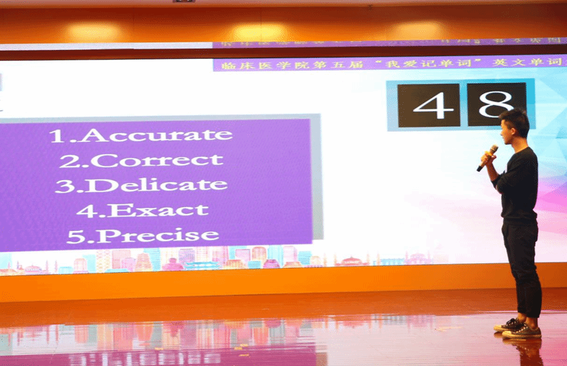 决赛采用单节淘汰制,分为“看图识词”、“词义辨析”和“知识抢答”三个环节,难度不断增加。“看图识词”着重考察选手对单个词语拼写、发音和释义的掌握;“词义辨析”侧重考察选手对于近义词的准确辨析和熟练使用;“知识抢答”则不仅考察选手对英语语言的熟悉程度,也考察对英语文化背景的掌握情况,对选手的应变能力与文化素养提出了更高要求。比赛过程中,选手们灵活应变,巧妙答题,沉着冷静,字正腔圆,一字一句尽显扎实功底和青春风采,现场气氛热烈,精彩纷呈。与此同时,主持人稳健的台风、评委们精彩的点评、工作人员周密的安排也给赛场气氛增加助力。此外,穿插在比赛环节中间的观众互动趣味横生,也一次次将现场的气氛推向高潮。