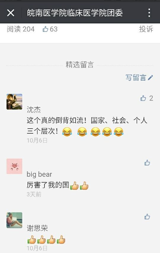 活动伊始,公司团委微信公众号平台便精心推出有关社会主义核心价值观的新闻稿并开放评论区,极大地激发了广大师生的兴趣。每次新闻推送后,院团委都会选取相关评论进行点评交流,确保活动质量与顺利开展。同学们纷纷留言表达自己对祖国拳拳热爱之心。2016级学子刘桐表示,通过此次活动,极大增强了自己对社会主义核心价值观的认知,为自己是中华儿女感到骄傲;2017级新生洪郑超表示社会主义核心价值观虽只是看似简单的24个字,其背后蕴含着深刻的哲理,今后要以更加严格的标准要求自己......