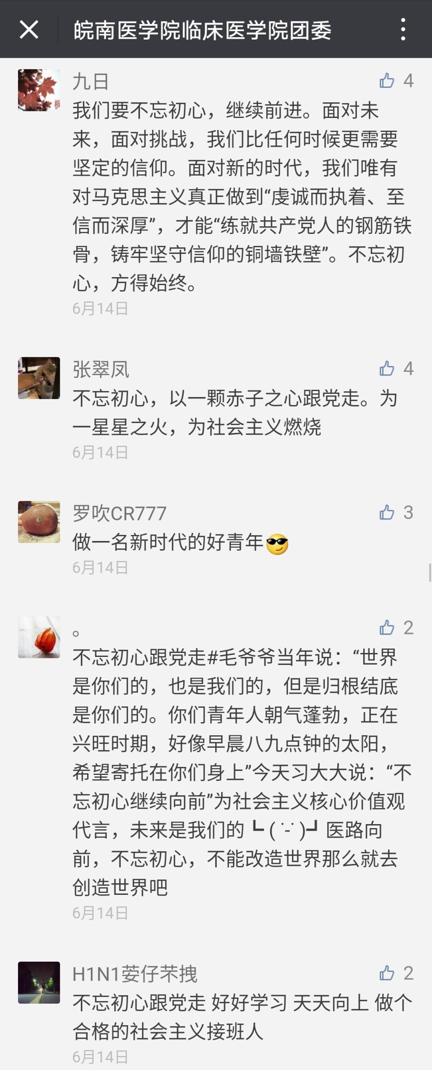 本次活动以纪念建团95周年、喜迎党的十九大为契机,以“不忘初心跟党走-我是团员-我为社会主义核心价值观代言”为主题,运用微信平台为广大团员提供与组织亲密交流的平台,营造青年团员学习和践行社会主义核心价值观的良好氛围。“我是吕立城,我爱中国共产党!做党的接班人!不忘初心!”“我是周倩,我为社会主义核心价值观代言!永远坚持党的领导!永远跟党走。”“我是韩旭,跟随党的步伐,创建美好明天。”“我是孙华蓉,争做合格党员,我为社会主义核心价值观代言。”一句句朴实热忱的话语,向全院传播了正能量,体现出团员青年紧紧跟随党的步伐,深入践行24字社会主义核心价值观的决心。