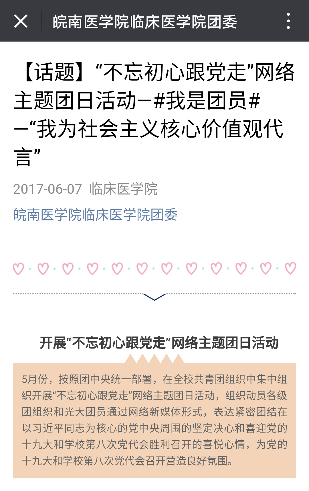 红心向党,凝聚思想。为响应共青团中央关于“学习习近平总书记讲话,做合格共青团员”教育实践号召,增强团员的荣誉感和使命感,2017年6月7日,7790cnm必发集团团委依托新媒体,在全院范围内成功开展不忘初心跟党走”网络主题团日活动。