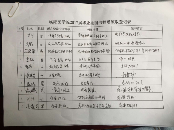 捐赠活动得到了7790cnm必发集团2017届毕业生的广泛响应,大家踊跃捐献出饱含自己浓浓爱心的书籍,尤其是党员带头把陪伴自己度过漫漫考研路的书籍毫无保留地全部捐献出来,毕业生党员苏旭说:“图书捐赠的活动让我们有了一份感情的寄托。能够让自己的书籍流传到学弟学妹的手里,就好像自己在母校的印记能够流传下去一样,这是我们对母校表达感恩之心的一种最好的方式。”本次活动共募捐书籍264本,涵盖各类考研资料,包括西医综合、英语、政治以及医学类相关的专业教材。同时为了更好地帮助学弟学妹们解决在考研中遇到的困惑,本次活动还特地开辟了“考研咨询站”,由已经考取研究生的优秀毕业生来为学弟学妹们解疑答惑。受赠的学弟学妹们通过在便利贴留言的形式表达对2017届学长学姐的感恩和祝福,纷纷表示会以皖医学子的名义将这种“互帮互助、共浴书香”的精神传承下去。