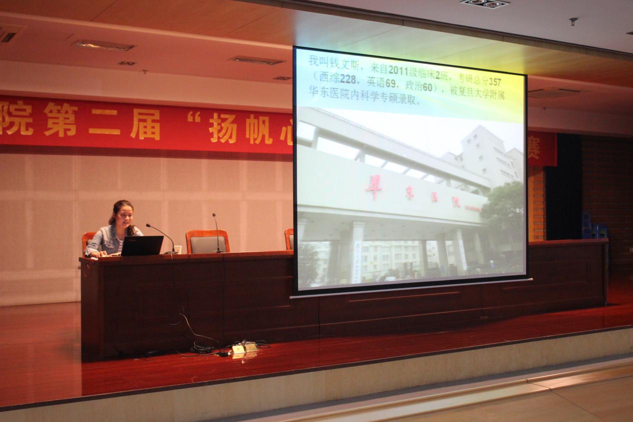 各位优秀毕业生代表从考研内容、院校选择、心理调节以及应试技巧等方面介绍了各自考研经历与学习心得。这为即将步入考研大军的同学们来说具有宝贵的借鉴作用。盛飞就考研目的、院校及专业的选择以及备考方法与同学们进行了详细讲解。李聪聪主要强调英语学习的重要性,并分享了自己的一些应试技巧,提醒同学们提早准备,轻松应考。曹灵以个人经历向同学们强调了备考中心理调试的重要性并分享了独到的调整策略,鼓励大家打好基础、坚定信心,持之以恒。钱文斯以备考与实习的时间冲突为切入点,强调了平衡心态、合理安排时间的重要性。王少华主要从备考资料选择,复习思路等方面分享了他独到的见解。最后11级同学还热情地为大家留下了联系方式,便于他们后期为学弟学妹们解答疑惑。