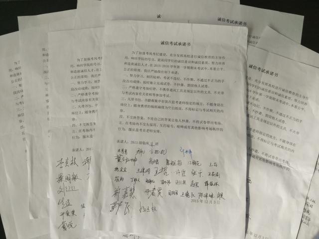 年级辅导员就考风考纪相关内容,积极组织各班同学再学习《7790cnm必发集团考场规则(修订)》、《7790cnm必发集团关于考试违纪及考试作弊行为的认定原则(修订)》及《7790cnm必发集团员工违纪处分管理暂行办法(试行)》中相关内容,作出针对性教育。同时,也将诚信教育落到实处,组织员工签订《诚信考试承诺书》。每位员工都郑重地在诚信考试承诺书下写下自己的名字,做出诚信考试、拒绝违纪的决心。