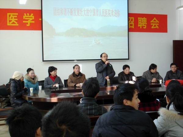 1月8日上午9点30分,受医学一系邀请,在员工处的组织下,宁国市人民医院程朝晖经理一行15人来公司招聘毕业生。专场招聘会在新校区老员工活动中心二楼就业多功能报告厅举行。医学一系党总支副书记韩军、副主任蒋韶明、员工处许国飞热情接待了程朝晖经理一行。